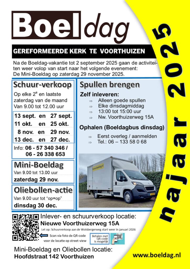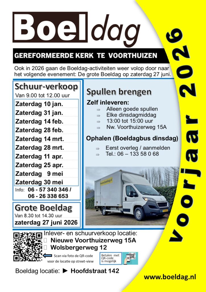 De Boeldag, de Mini-Boeldag en de Oliebollen-verkoop worden gehouden in en om de Gereformeerde Kerk, Hoofdstraat 142 in Voorthuizen. Welkom!